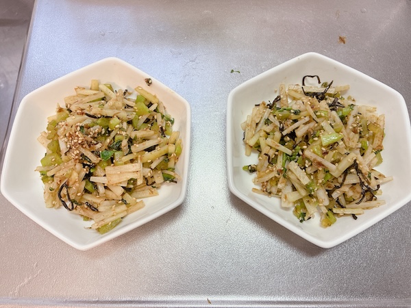 これは大根の皮と葉をごま油で炒め、それにかつおぶし、塩昆布、白ごまを和えたものです。