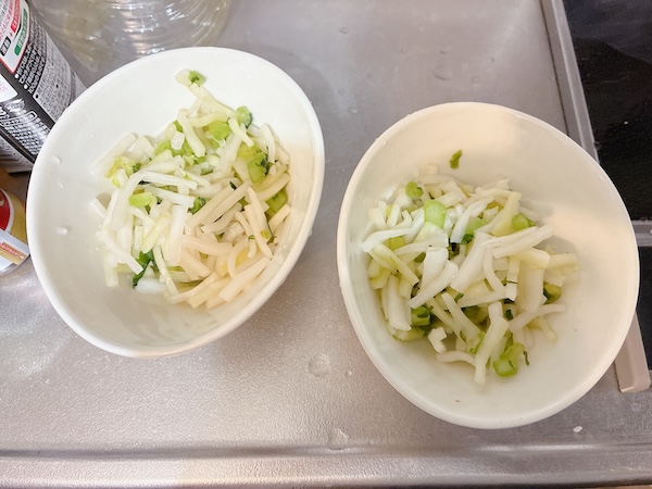 こちらは大根の皮と葉を塩もみして少し水を抜いてからすし酢に小一時間ほど漬け込んだ漬物。