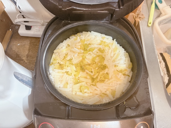 そしてご飯にも大根の皮と葉。塩をいれて一緒に炊き上げます。炊きあがった後にごま油をかけるのがミソ。